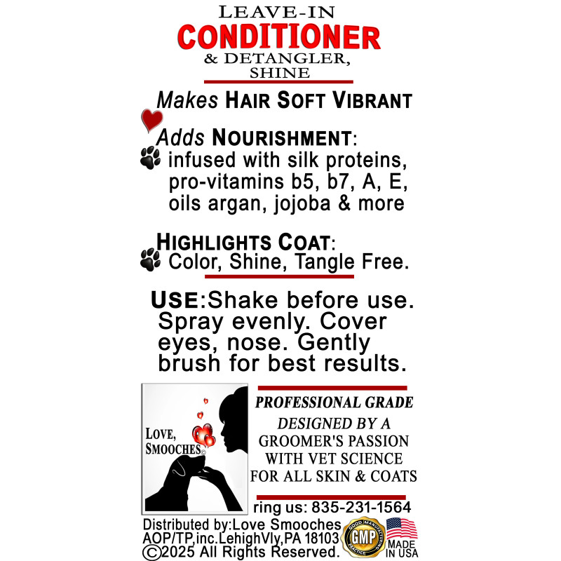 Love Smooches Leave-in Conditioner -- Detangler & Shine Enhancer -- (roughly 11 months supply *based on weekly baths)... Makes Hair Soft & Vibrant ... Adds Nourishment (infused silk proteins, ProV b5, b7, A E, 1 or more of oils: argan jojoba & more) .... Highlights Coat (color brightness, healthy shine, Tangle free) -- Designed by a Groomers Passion, Vet Science, Breeder & Show Ring Champion Handlers